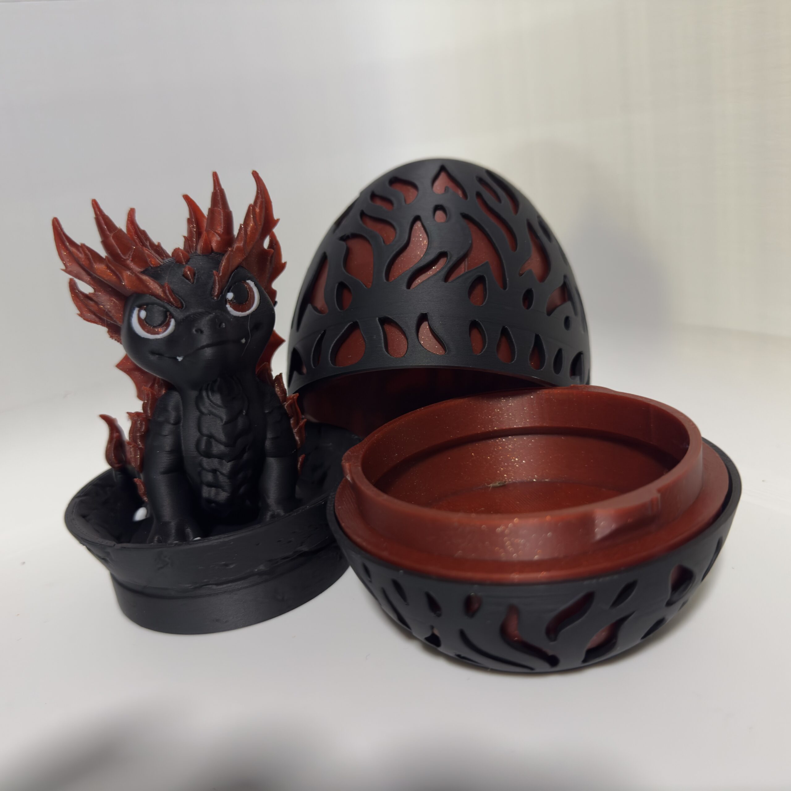 The egg is designed in multiple parts and features flame‑shaped cutouts that echo the dragon’s fire motif. The baby dragon fits neatly inside the egg, allowing it to be stored or displayed as if waiting to hatch. The egg itself sits perfectly on the same base used by the dragon, creating a unified presentation.