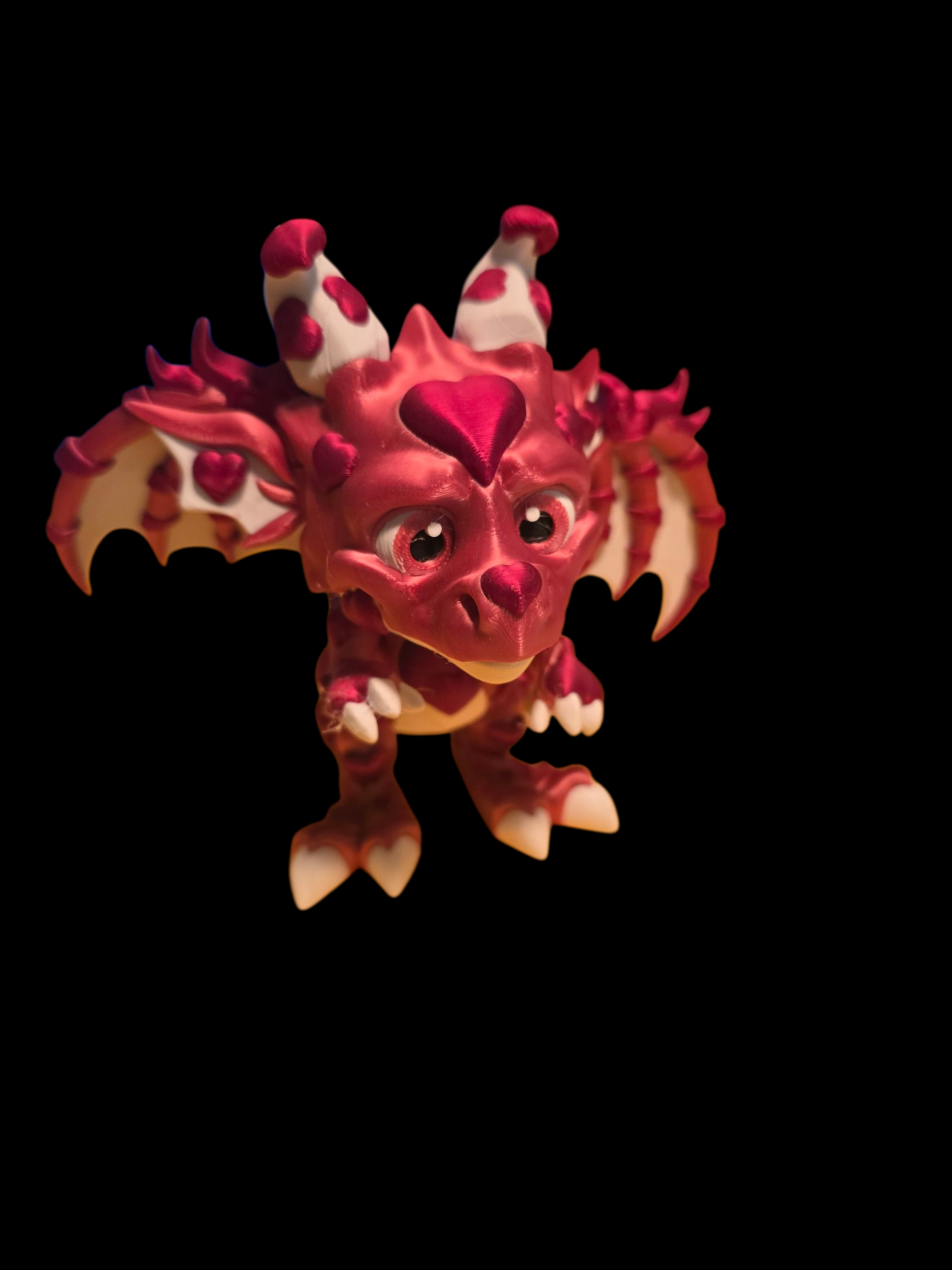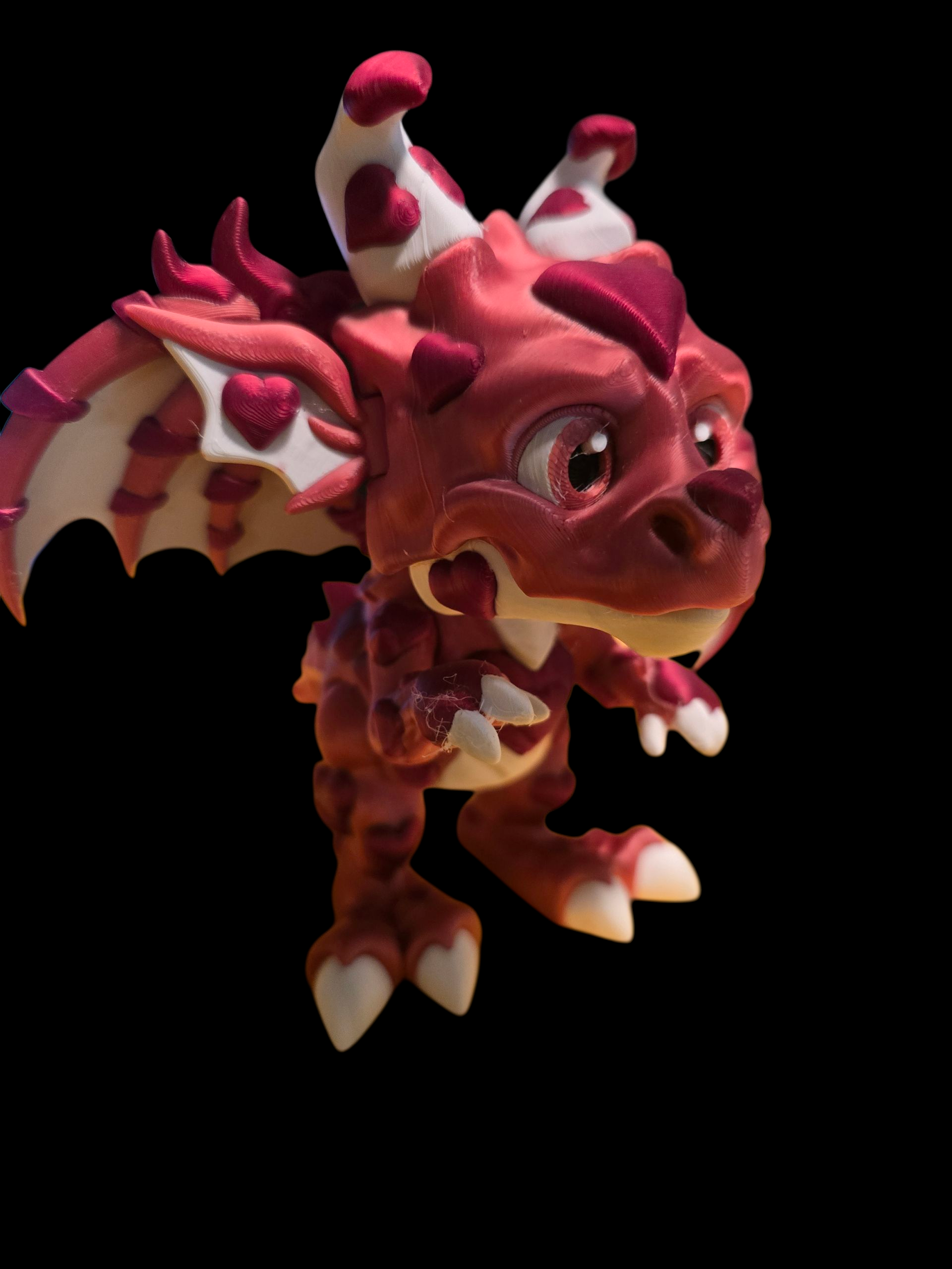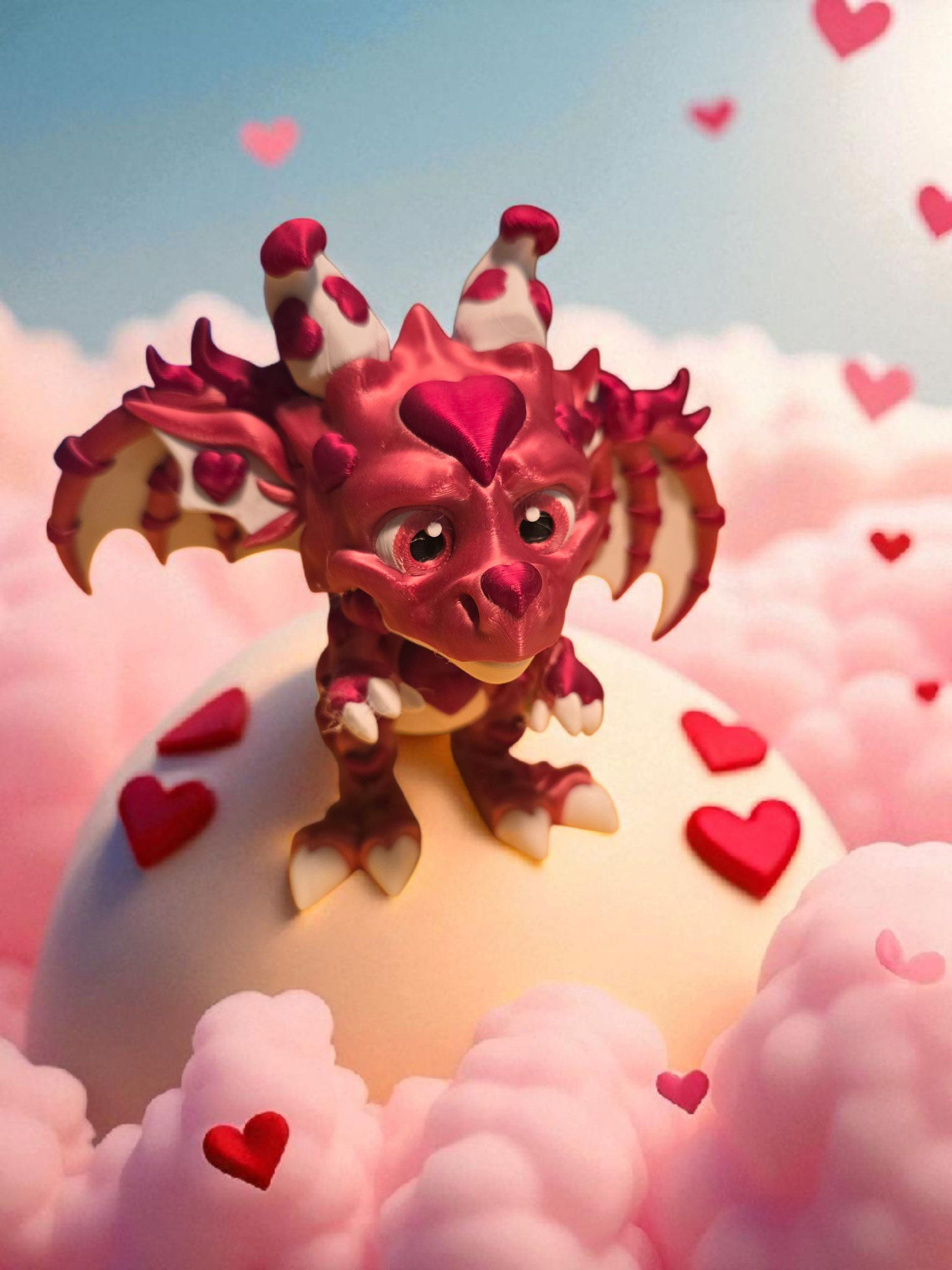 Meet the Love Dragon, a whimsical fusion of fantasy and affection brought to life through vibrant 3D printing. This enchanting creature features a soft pink body accented with snowy white wings, horns, and claws, exuding a playful yet elegant charm. Heart-shaped patterns adorn its wings and forehead, making it the perfect symbol of love and magic—ideal for Valentine’s Day gifts, fantasy collections, or simply brightening up your desk.