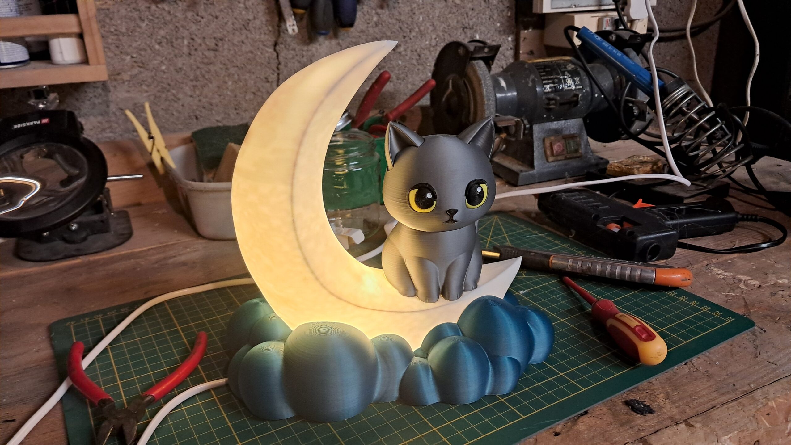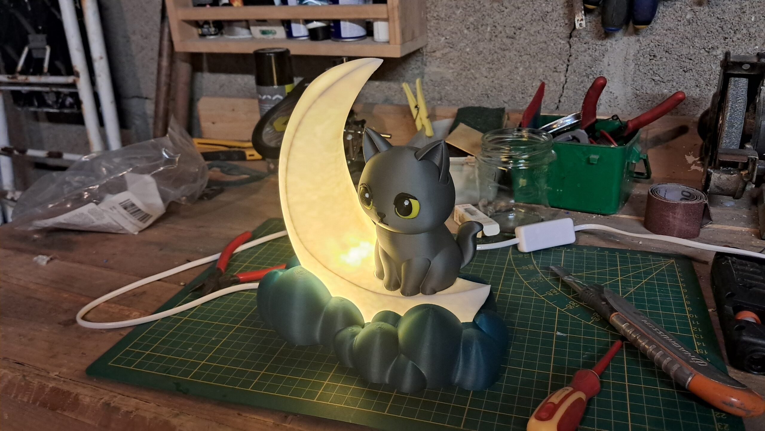 En haut d’un croissant lumineux, ce chat adorable apporte le réconfort tranquille de la nuit avec une lumière douce parfaite pour les rêveurs.