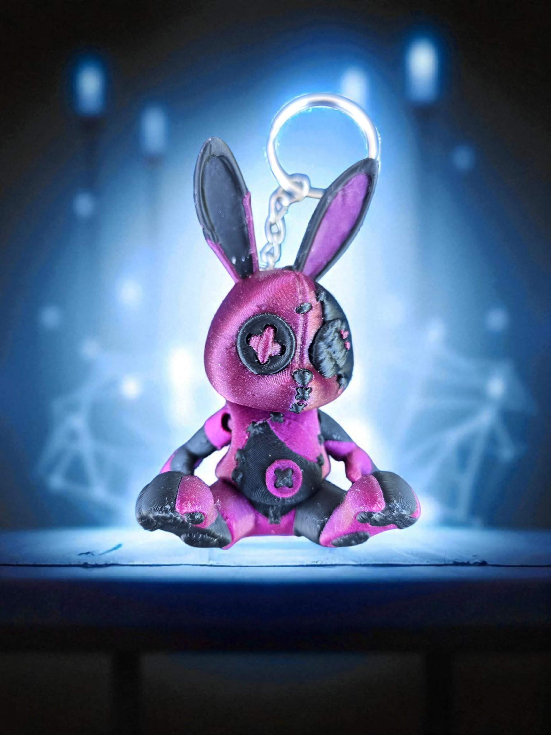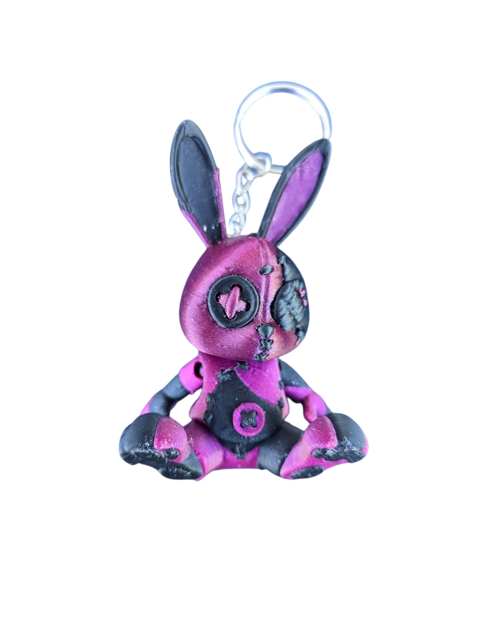 A patchwork rabbit rendered in clean 3D lines where gothic charm meets cuddle-ready design. Black, pink, and purple panels form a stitched body with stitched X eyes that read as mischievous rather than menacing. The ear-mounted loop and compact seated pose make it a ready companion for keys, backpacks, or zipper pulls.