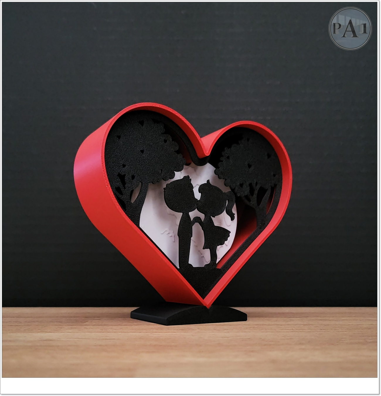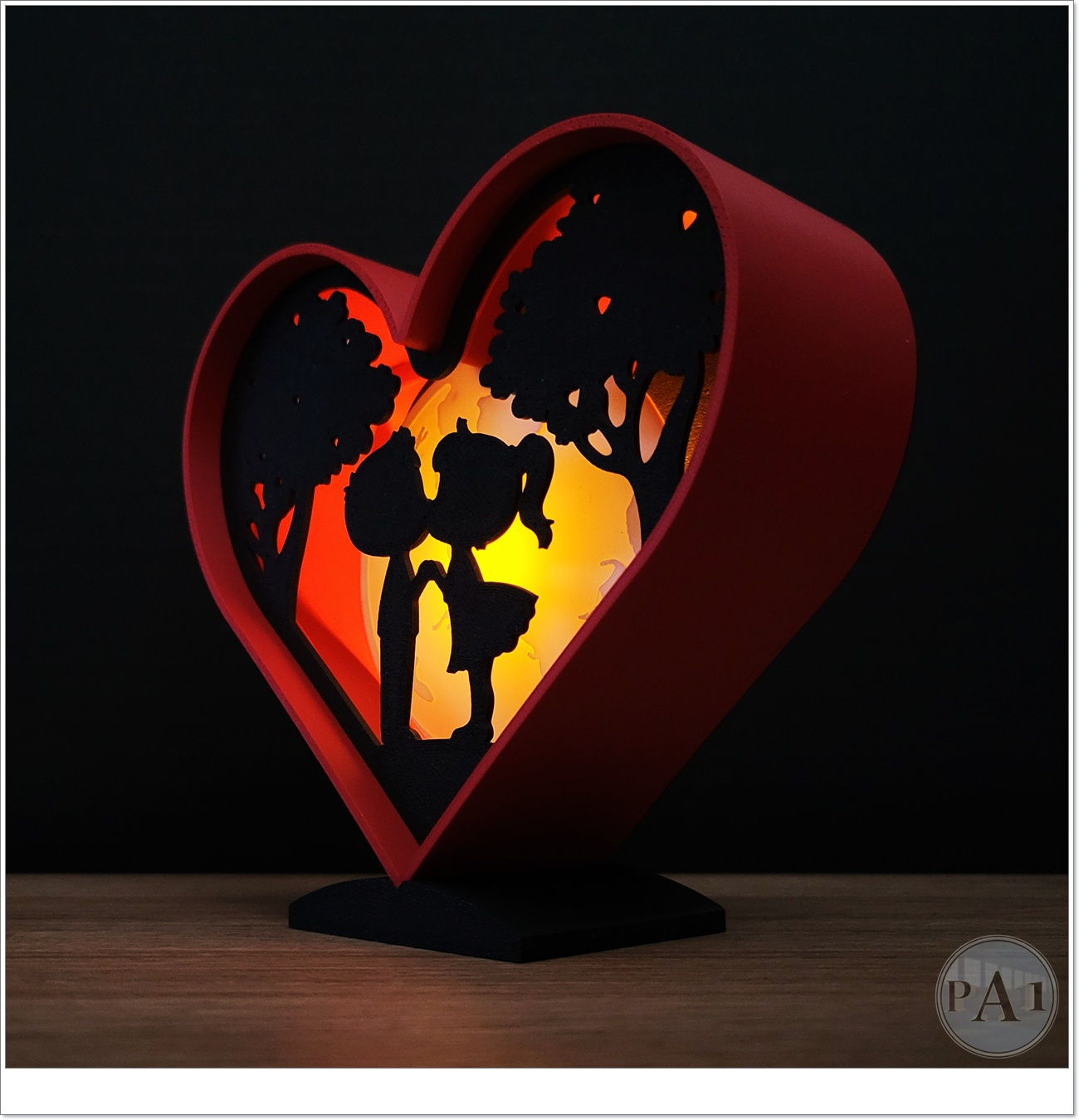 A little light box, both cartoonish and romantic, featuring two little lovers in front of the moon.